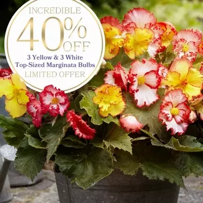 This offer brings six standout begonias—three Begonia Marginata White, three Begonia Marginata Yellow - each bulb sized at 5/+ cm. Our larger bulbs mean stronger plants, richer colour, and a display which builds quickly. Same planting routine you already trust, yet results feel like a private upgrade.